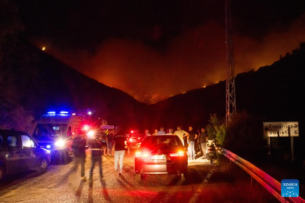 People and emergency vehicles are pictured near a wildfire in the Odemis district of Izmir, Türkiye, on July 3, 2025. Izmir Governor Suleyman Elban said on Thursday that the wildfire erupted on Wednesday afternoon in the Cesme district, a popular coastal tourist destination. The blaze has been taken under control, but the inland district of Odemis remains uncontrolled, he added.