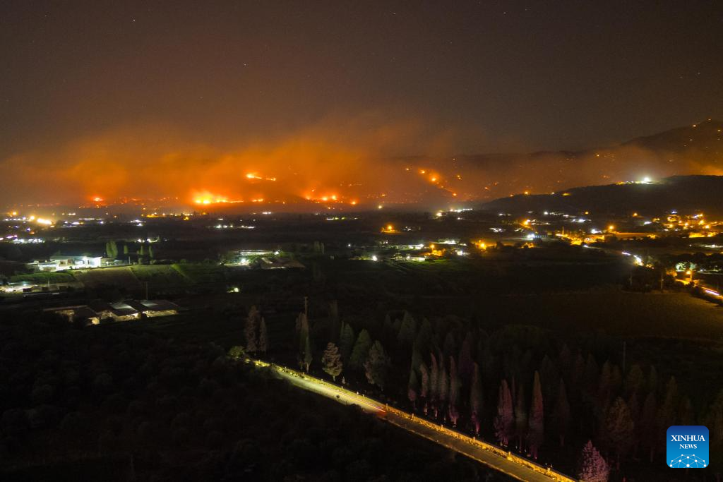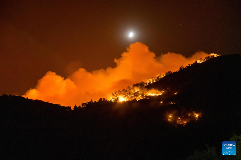 This photo taken on July 2, 2025 shows a wildfire in the Odemis district of Izmir, Türkiye. Izmir Governor Suleyman Elban said on Thursday that the wildfire erupted on Wednesday afternoon in the Cesme district, a popular coastal tourist destination. The blaze has been taken under control, but the inland district of Odemis remains uncontrolled, he added.
