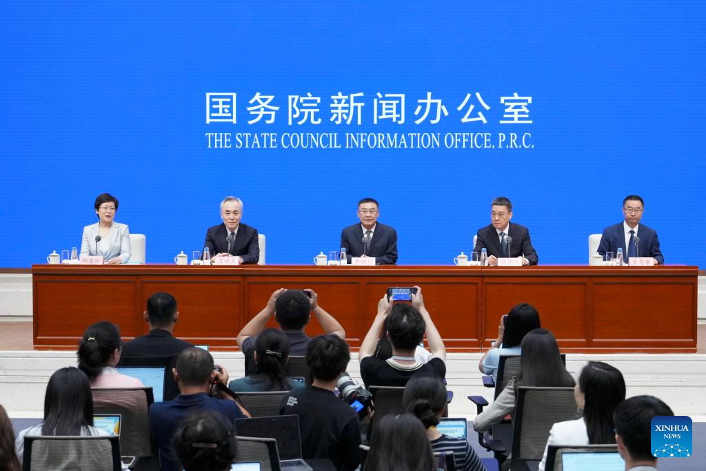 China's State Council Information Office holds a press conference on an array of cultural events marking the 80th anniversary of the victory in the Chinese People's War of Resistance Against Japanese Aggression and the World Anti-Fascist War, in Beijing, capital of China, July 3, 2025. Vice Minister of Culture and Tourism Lu Yingchuan, Vice Minister of the National Radio and Television Administration Liu Jianguo, Vice President of the China Media Group Wang Xiaozhen, and President of the Museum of the War of Chinese People's Resistance Against Japanese Aggression Luo Cunkang briefed the media on a themed exhibition, the release of outstanding literary and artistic works, and other related events, and took questions from reporters. (Xinhua/Cai Yang)