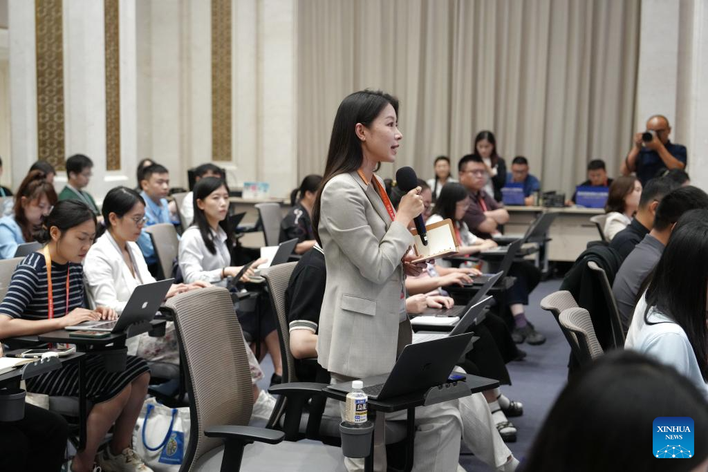 A reporter asks questions at a press conference held by China's State Council Information Office on an array of cultural events marking the 80th anniversary of the victory in the Chinese People's War of Resistance Against Japanese Aggression and the World Anti-Fascist War, in Beijing, capital of China, July 3, 2025. Vice Minister of Culture and Tourism Lu Yingchuan, Vice Minister of the National Radio and Television Administration Liu Jianguo, Vice President of the China Media Group Wang Xiaozhen, and President of the Museum of the War of Chinese People's Resistance Against Japanese Aggression Luo Cunkang briefed the media on a themed exhibition, the release of outstanding literary and artistic works, and other related events, and took questions from reporters. (Xinhua/Cai Yang)