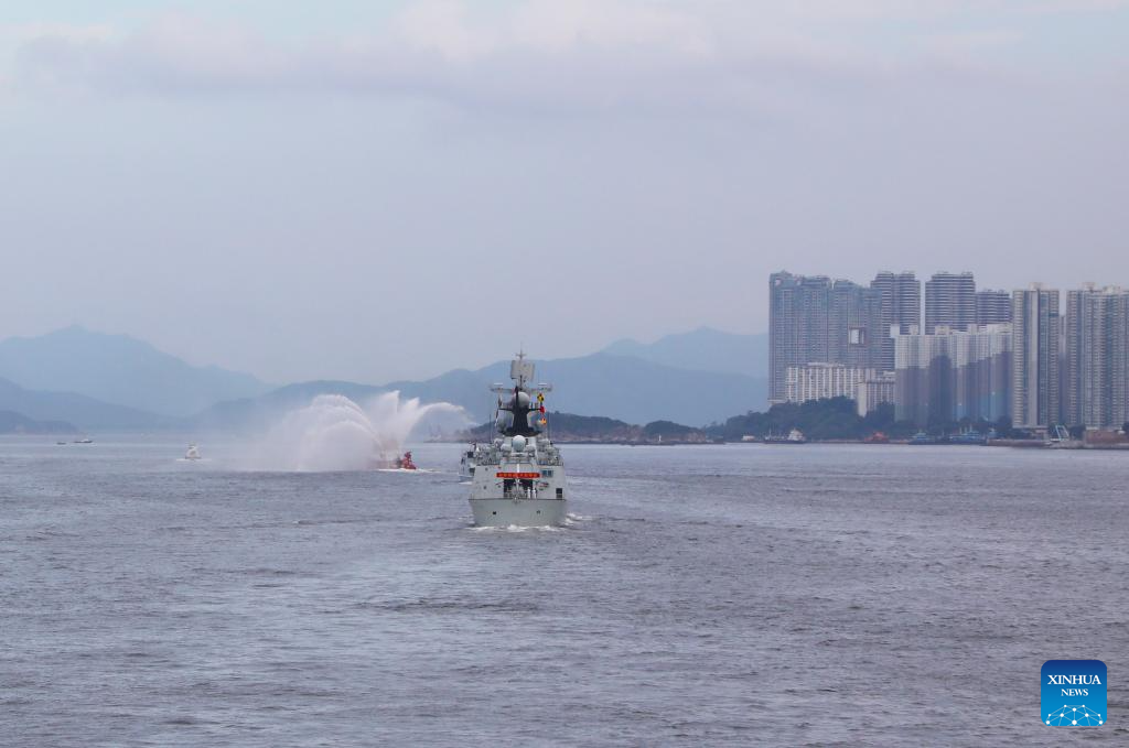 A fireboat of the Hong Kong Special Administrative Region government performs a water gate ceremony for the Chinese People's Liberation Army Navy fleet in Hong Kong, south China, July 3, 2025. A fleet of the Chinese People's Liberation Army Navy led by the aircraft carrier Shandong arrived here on Thursday morning. (Xinhua/Li Yun)