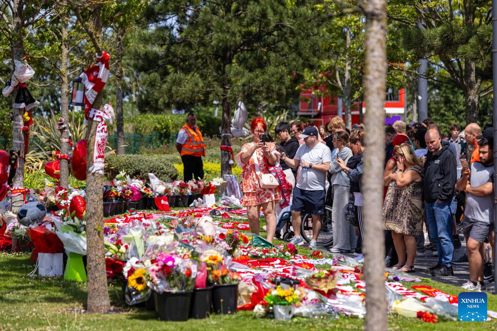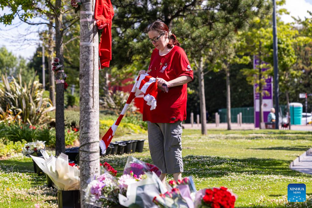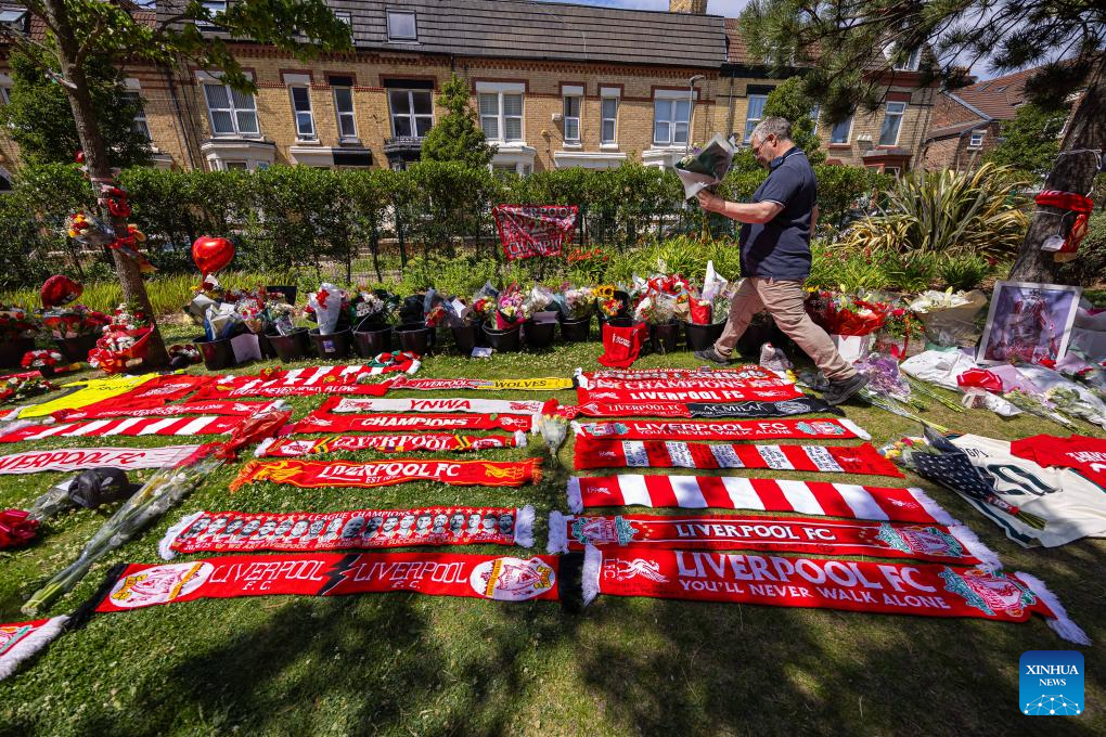 People pay tribute to Diogo Jota outside Anfield Stadium in Liverpool, Britain, July 3, 2025. Liverpool's Portuguese international forward Diogo Jota and his brother Andre died in the early hours of Thursday morning in a car accident in north-east Spain, according to Spanish authorities. (Xinhua)