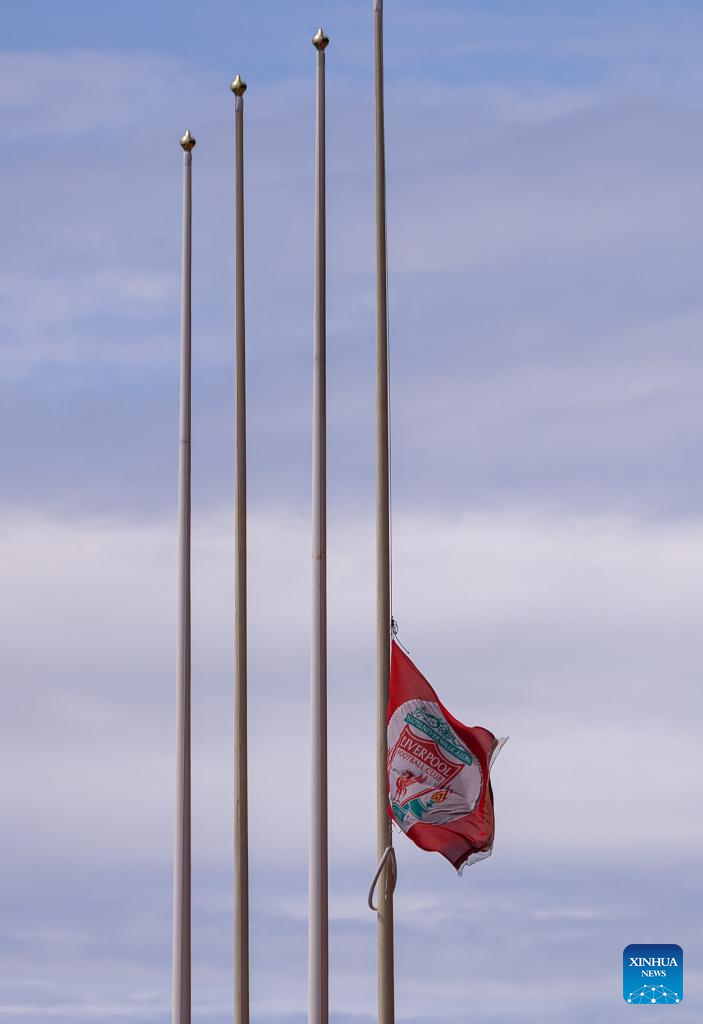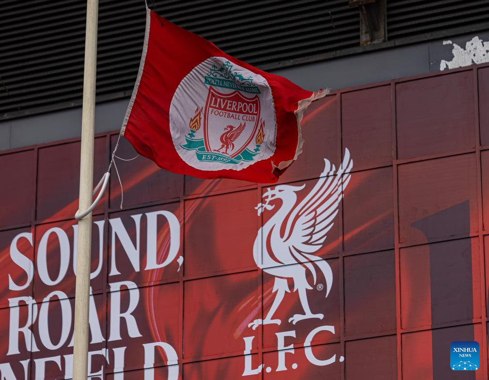 Liverpool FC flag flies at half-mast outside Anfield Stadium in Liverpool, Britain, July 3, 2025. Liverpool's Portuguese international forward Diogo Jota and his brother Andre died in the early hours of Thursday morning in a car accident in north-east Spain, according to Spanish authorities. (Xinhua)