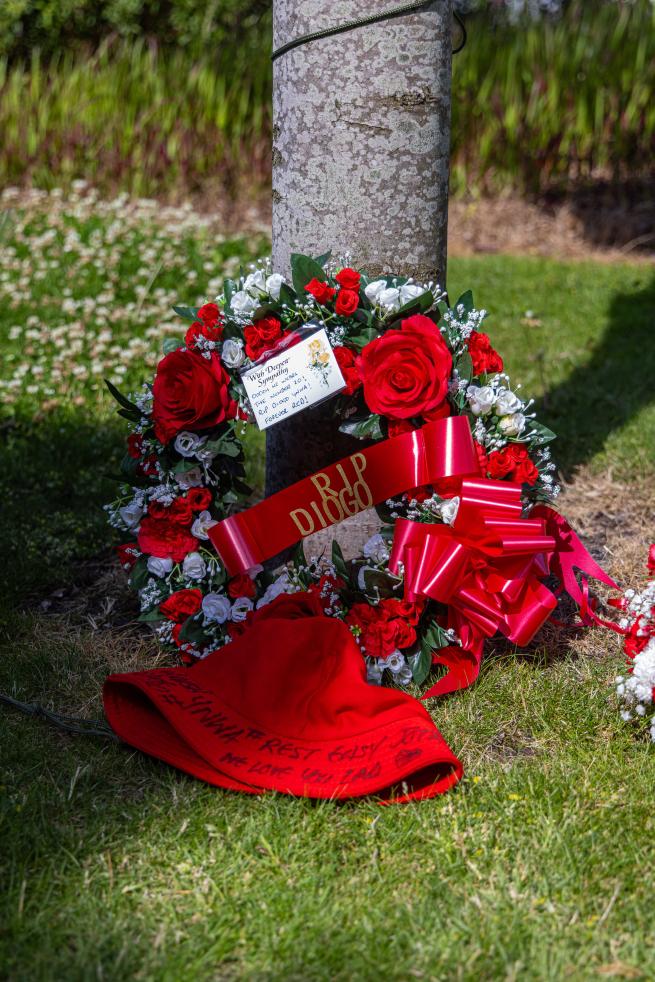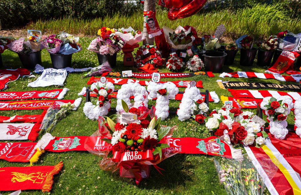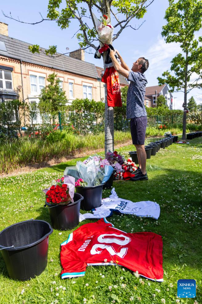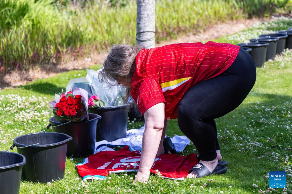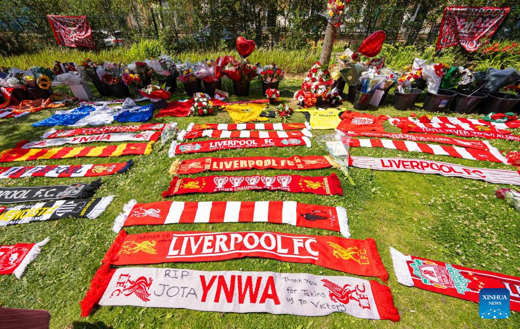 Flowers and tributes to Diogo Jota are left outside Anfield Stadium in Liverpool, Britain, July 3, 2025. Liverpool's Portuguese international forward Diogo Jota and his brother Andre died in the early hours of Thursday morning in a car accident in north-east Spain, according to Spanish authorities. (Xinhua)
