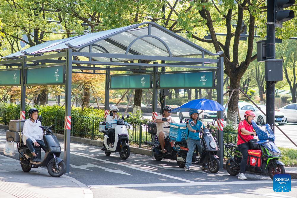 Riders wait for traffic light under a shelter in Hangzhou, east China's Zhejiang Province, July 3, 2025. Hangzhou issued an orange heat alert on Thursday. (Xinhua/Jiang Han)