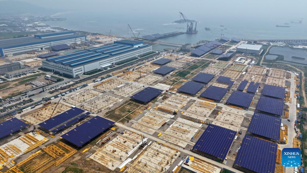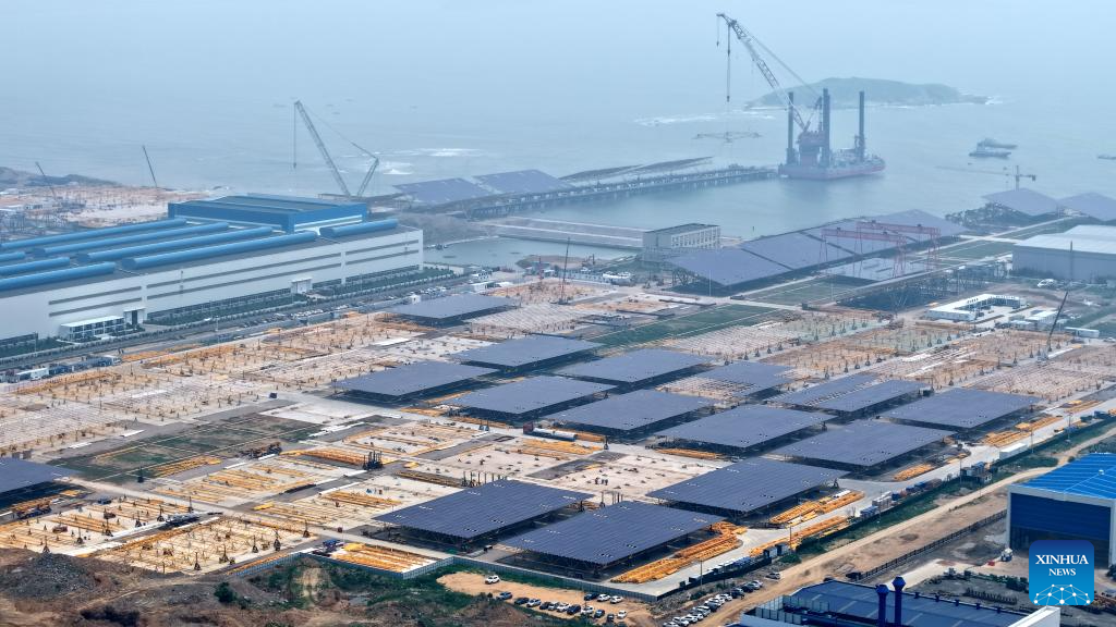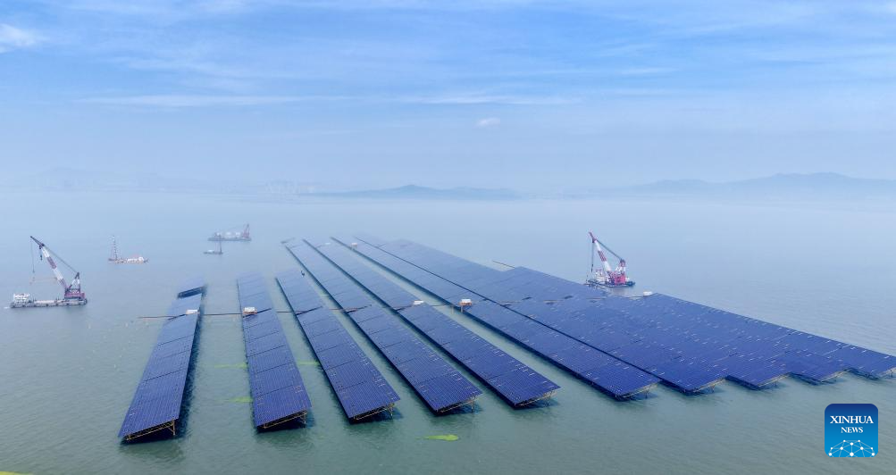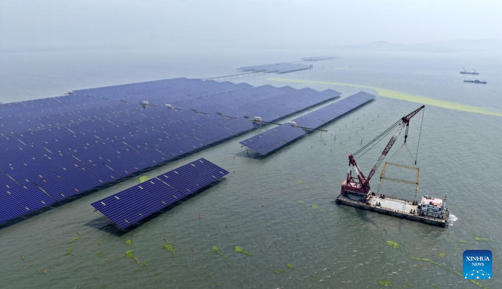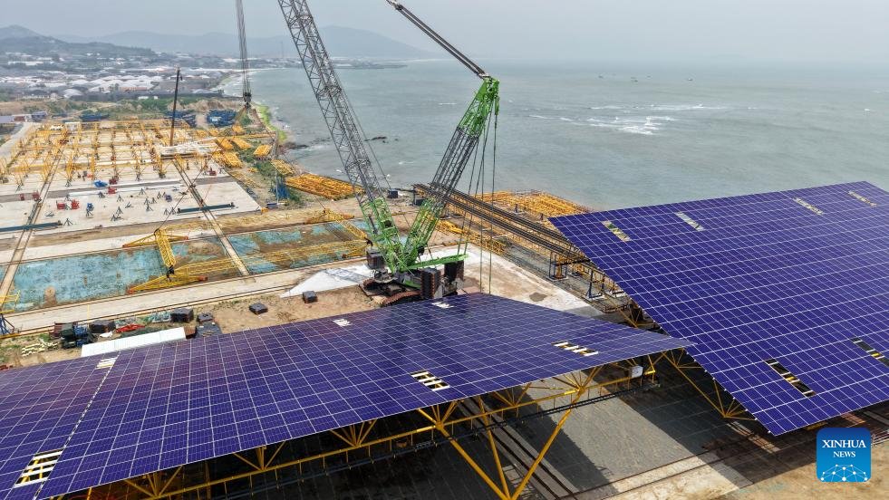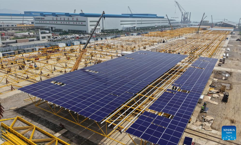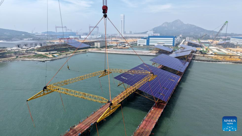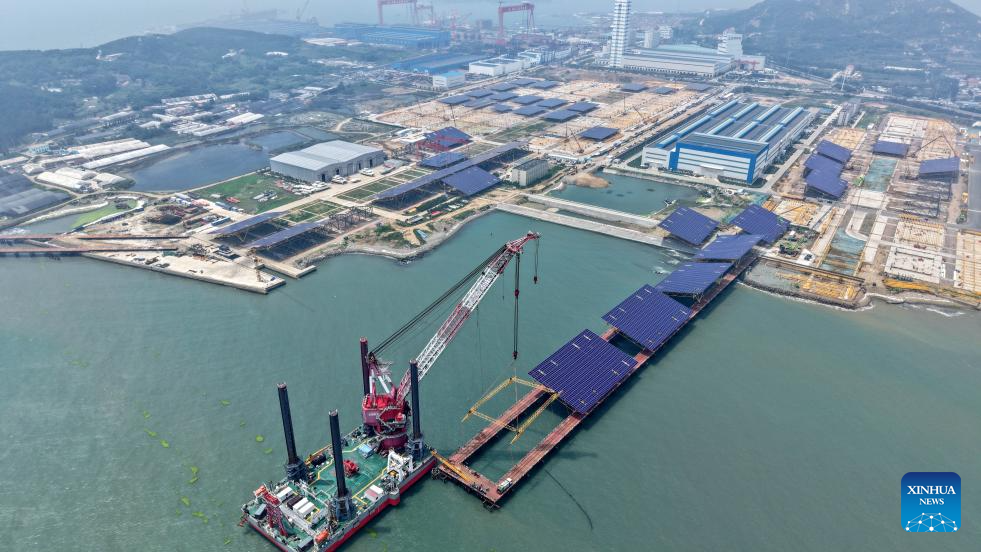 An aerial drone photo taken on July 3, 2025 shows an assembly site of a photovoltaic project in Jimo District of Qingdao, east China's Shandong Province. The first phase of an integrated fishery and photovoltaic project has started generating electricity off the coast of Qingdao. This offshore solar facility combines clean energy generation with sustainable marine aquaculture.