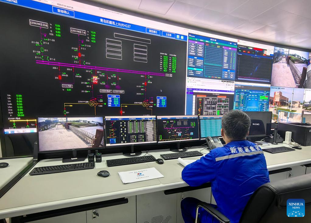 A staff member works at a control room of an offshore integrated fishery and photovoltaic project in Jimo District, Qingdao, east China's Shandong Province, July 3, 2025. The first phase of an integrated fishery and photovoltaic project has started generating electricity off the coast of Qingdao. This offshore solar facility combines clean energy generation with sustainable marine aquaculture.