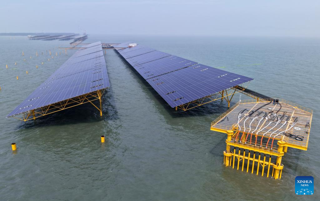 An aerial drone photo taken on July 3, 2025 shows an offshore integrated fishery and photovoltaic project in Aoshan Bay of Jimo District, Qingdao, east China's Shandong Province. The first phase of an integrated fishery and photovoltaic project has started generating electricity off the coast of Qingdao. This offshore solar facility combines clean energy generation with sustainable marine aquaculture.