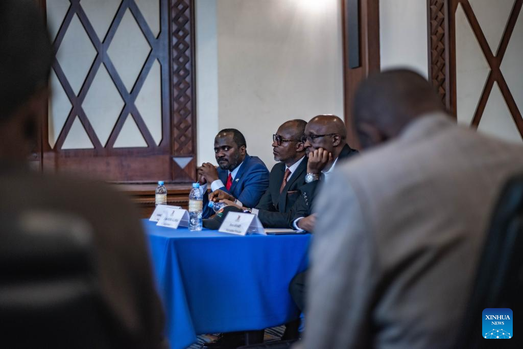 Benjamin Mbonimpa (R, Rear), the Congo River Alliance (AFC)'s permanent secretary and head of its delegation to the Doha talks, attends a press conference in Goma, the capital of North Kivu Province, eastern Democratic Republic of the Congo, on July 3, 2025. A new round of talks between the Democratic Republic of the Congo (DRC) government and the March 23 Movement (M23) rebel group is expected to unfold soon in Doha, the capital of Qatar, a senior official of the Congo River Alliance (AFC), a politico-military coalition allied with the M23, said on Thursday. (Photo by Zanem Nety Zaidi/Xinhua)