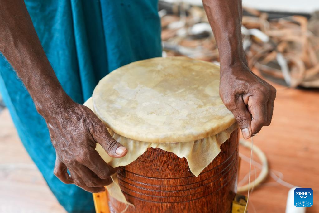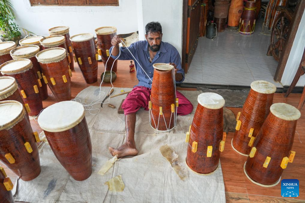 A person assembles a traditional drum in Kadugannawa, Sri Lanka, July 3, 2025. The central region of Sri Lanka, especially Kadugannawa, is famous for the making and use of traditional wooden drums, which play an important role in Sri Lankan rituals and dances. (Photo by Thilina Kaluthotage/Xinhua)