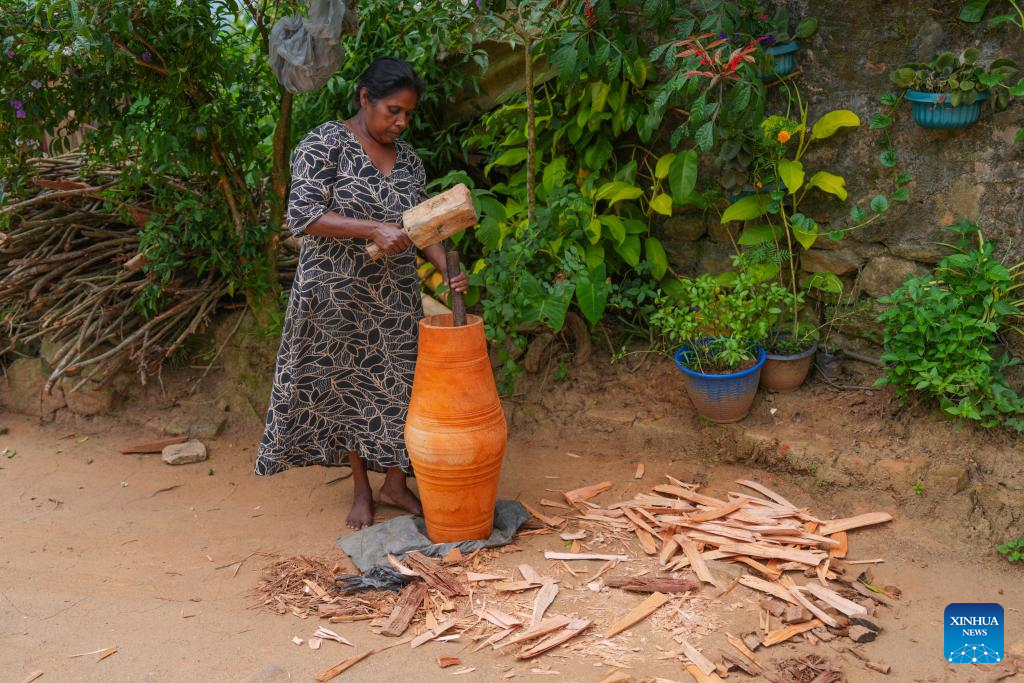 A woman processes the barrel of a traditional drum in Kadugannawa, Sri Lanka, July 3, 2025. The central region of Sri Lanka, especially Kadugannawa, is famous for the making and use of traditional wooden drums, which play an important role in Sri Lankan rituals and dances. (Photo by Thilina Kaluthotage/Xinhua)