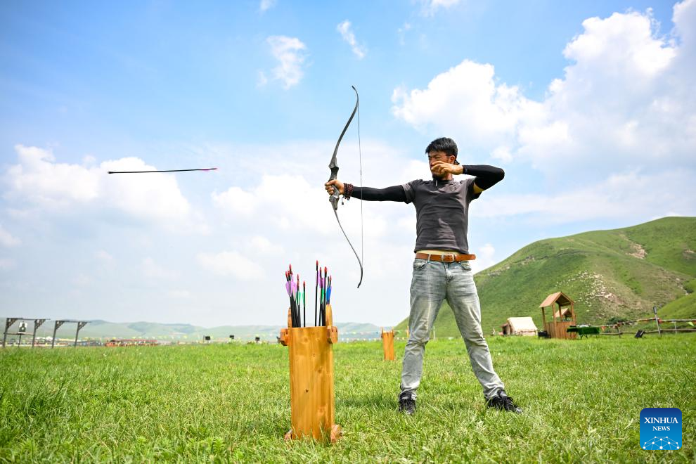 A tourist experiences archery at the Wulanmaodu pasture in Horqin Right Wing Front Banner, Hinggan League, north China's Inner Mongolia Autonomous Region, July 4, 2025. In the first half of this year, the banner recorded 2.55 million tourist trips, with total tourism expenditure reaching 882 million yuan (about 123.12 million U.S. dollars). (Xinhua/Bei He)