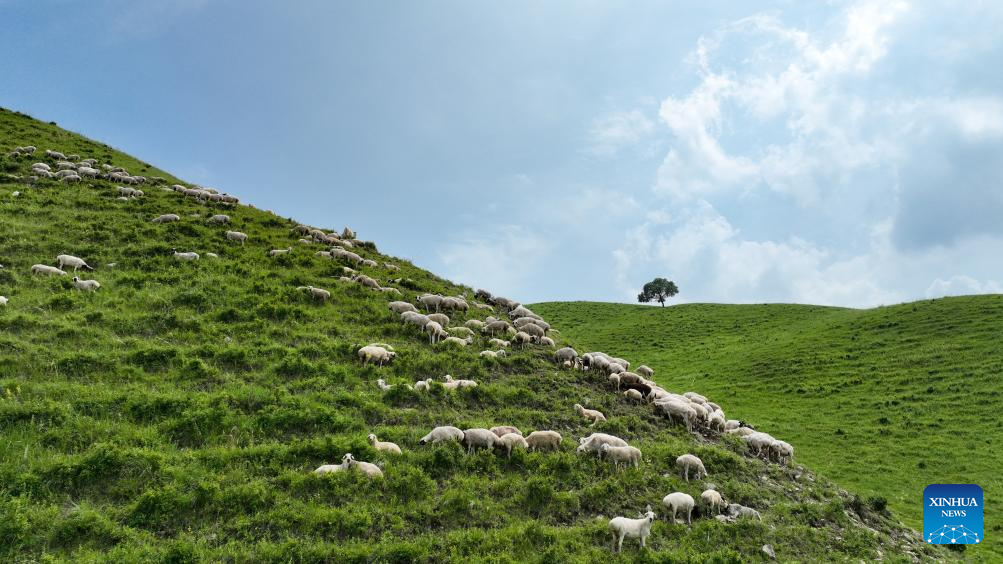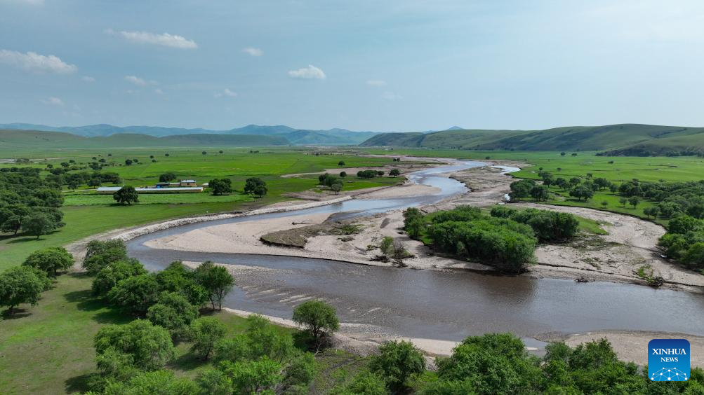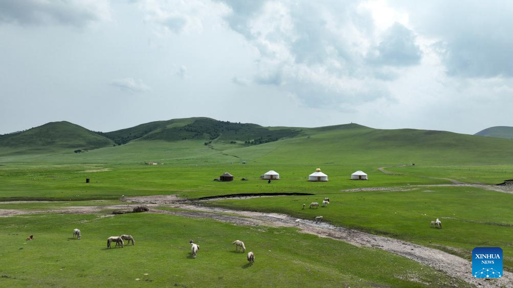 An aerial drone photo taken on July 4, 2025 shows the scenery of the Wulanmaodu pasture in Horqin Right Wing Front Banner, Hinggan League, north China's Inner Mongolia Autonomous Region. In the first half of this year, the banner recorded 2.55 million tourist trips, with total tourism expenditure reaching 882 million yuan (about 123.12 million U.S. dollars). (Xinhua/Bei He)