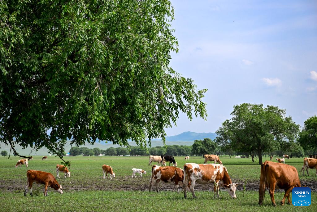 This photo taken on July 4, 2025 shows the scenery of the Wulanmaodu pasture in Horqin Right Wing Front Banner, Hinggan League, north China's Inner Mongolia Autonomous Region. In the first half of this year, the banner recorded 2.55 million tourist trips, with total tourism expenditure reaching 882 million yuan (about 123.12 million U.S. dollars). (Xinhua/Bei He)