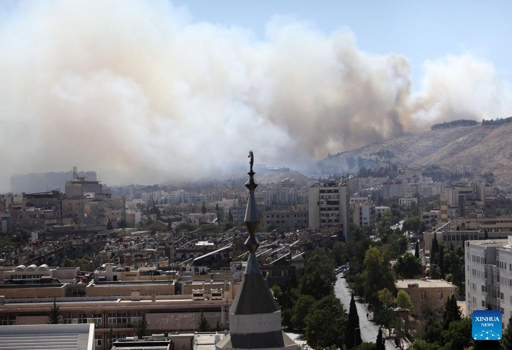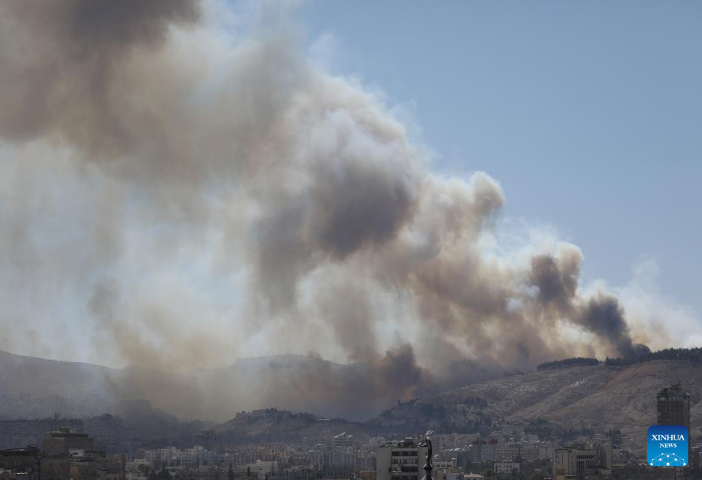 Smoke rises as a result of a fire that erupted near the Syrian al-Shaab presidential palace in Damascus, Syria, July 4, 2025. Unknown fire erupted Friday afternoon in bushes close to the Syrian al-Shaab presidential palace situated on top of a mountain overlooking the capital Damascus, sending thick plums of black smoke over wide areas, local media and witnesses said. (Photo by Ammar Safarjalani/Xinhua)