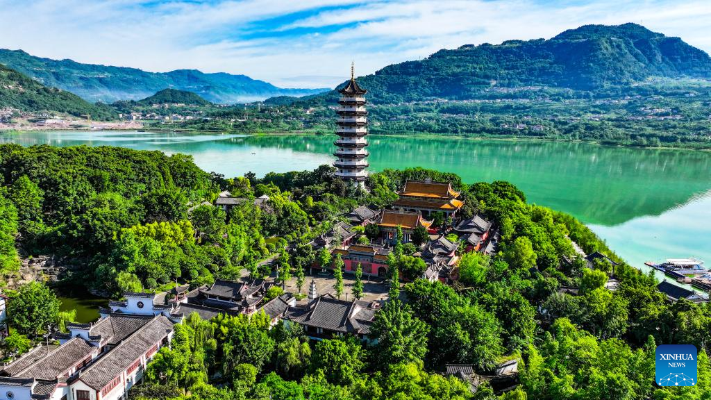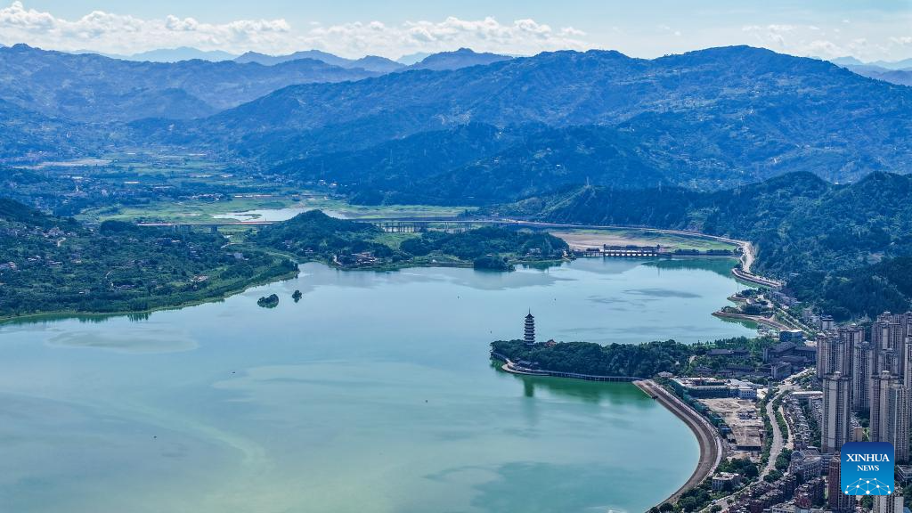A drone photo taken on July 3, 2025 shows a view of urban area of Kaizhou District in southwest China's Chongqing. Kaizhou is noted for a scenic internal lake named Hanfeng, with a capacity of 80 million cubic meters. This artificial lake was built after the completion of the Three Gorges Dam. (Xinhua/Wang Quanchao)
