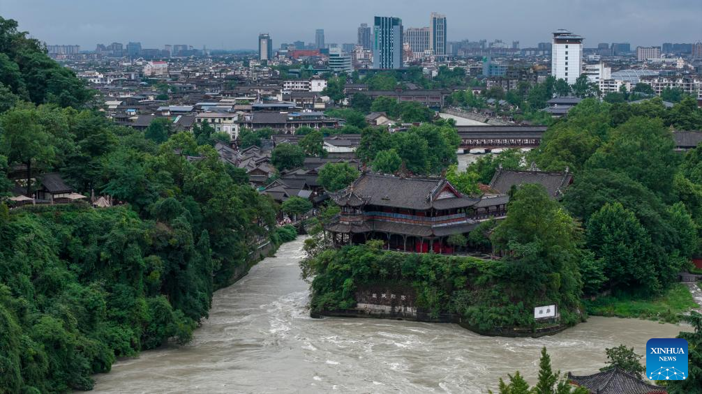 An aerial drone photo taken on July 4, 2025 shows a view of Dujiangyan irrigation system in southwest China's Sichuan Province. Dujiangyan irrigation system on the Minjiang River saw a flood peak on Friday. (Photo by He Bo/Xinhua)