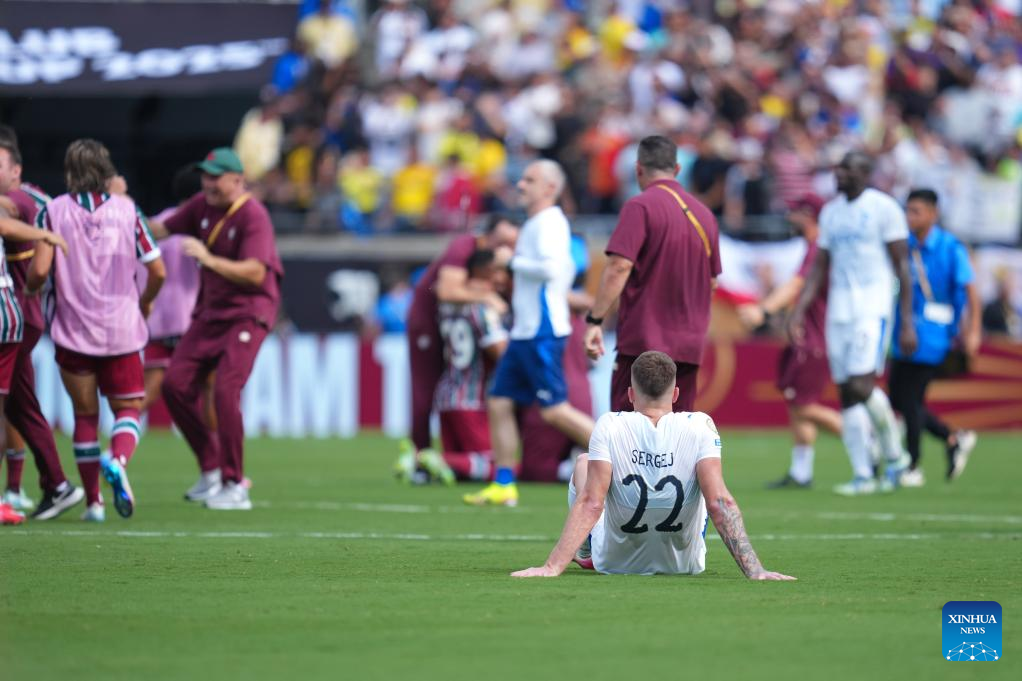 Everaldo (R) of Fluminense FC reacts during the quarterfinal match between Fluminense FC of Brazil and Al Hilal of Saudi Arabia at the FIFA Club World Cup 2025 at the Camping World Stadium, Orlando, Florida, the United States, July 4 , 2025. (Xinhua/Xu Chang)
