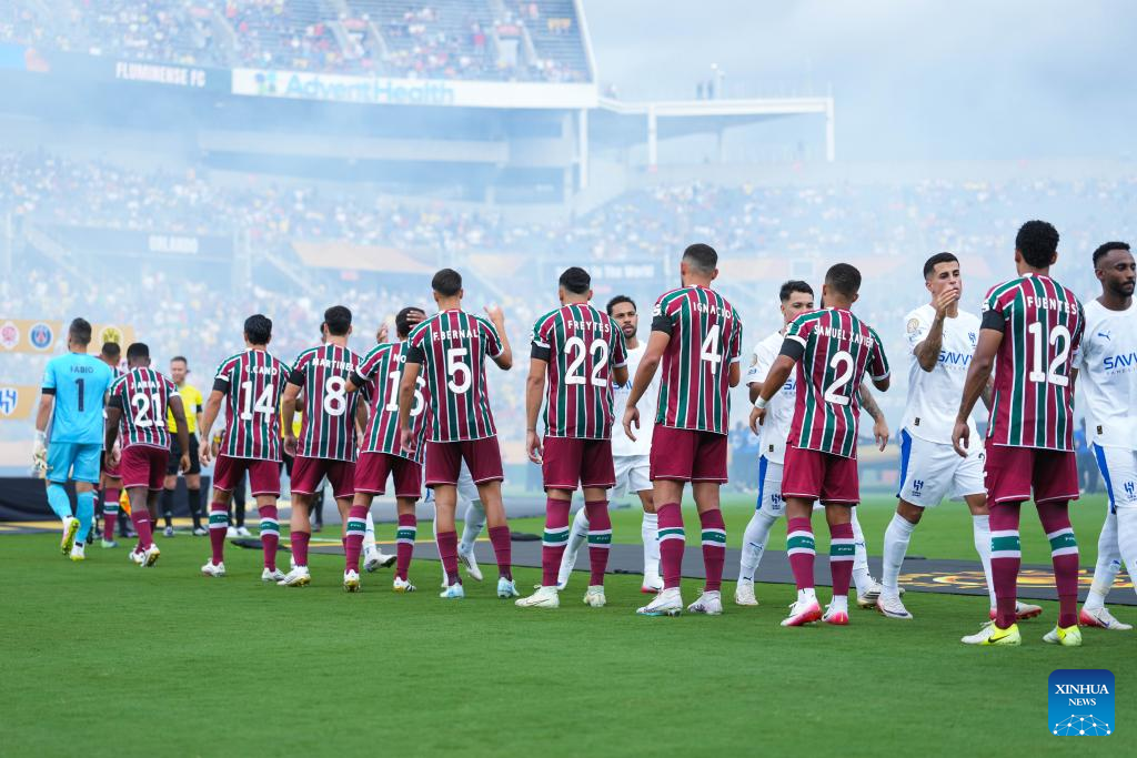 Players of both teams greet each other before the quarterfinal match between Fluminense FC of Brazil and Al Hilal of Saudi Arabia at the FIFA Club World Cup 2025 at the Camping World Stadium, Orlando, Florida, the United States, July 4 , 2025. (Xinhua/Xu Chang)