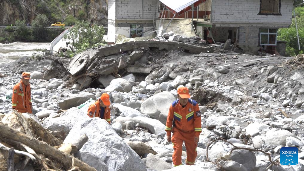 Rescuers search for survivors at a site of mudslide in Rongchag County, Garze Tibetan Autonomous Prefecture, southwest China's Sichuan Province, July 5, 2025. (Xinhua)