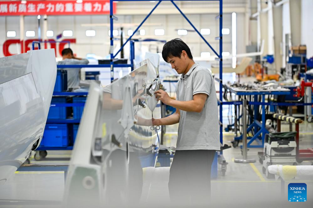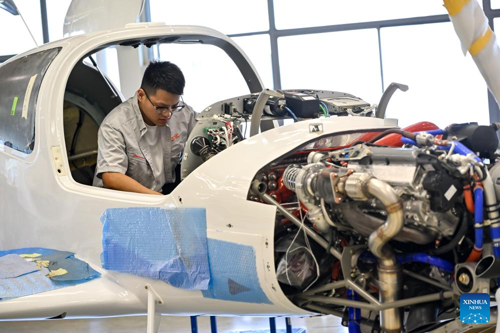 A worker assembles a general aviation aircraft at the workshop of CETC Wuhu Diamond Aircraft Manufacture Co., Ltd. in Wuhu City, east China's Anhui Province, July 3, 2025. In recent years, Anhui Province has accelerated the layout of its aerospace information industry, which encompasses low-altitude economy, commercial space, satellite applications, and deep space exploration. From booming "low altitude economy" such as drone delivery and low-altitude tourism, to the aggregation of enterprises into a commercial space industry chain, and the accelerating development of deep space exploration, Anhui further enhanced its independent innovation capabilities, and elevated aerospace information industry into a new growth pole for its economic development. (Xinhua/Zhang Cheng)