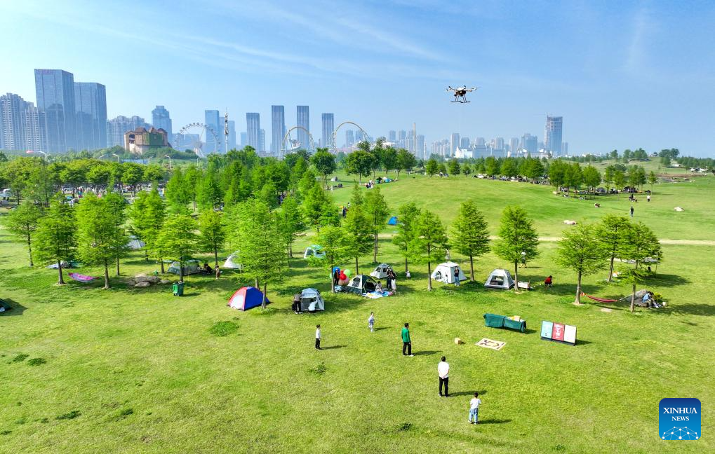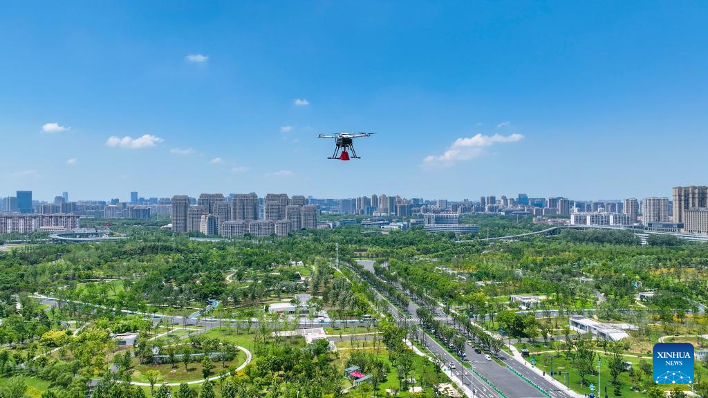(250705) -- HEFEI, July 5, 2025 (Xinhua) -- An aerial drone photo taken on July 5, 2024 shows a drone delivering a takeout at Luogang Park in Hefei, east China's Anhui Province. In recent years, Anhui Province has accelerated the layout of its aerospace information industry, which encompasses low-altitude economy, commercial space, satellite applications, and deep space exploration. From booming "low altitude economy" such as drone delivery and low-altitude tourism, to the aggregation of enterprises into a commercial space industry chain, and the accelerating development of deep space exploration, Anhui further enhanced its independent innovation capabilities, and elevated aerospace information industry into a new growth pole for its economic development. (Photo by Luo Haoyu/Xinhua)