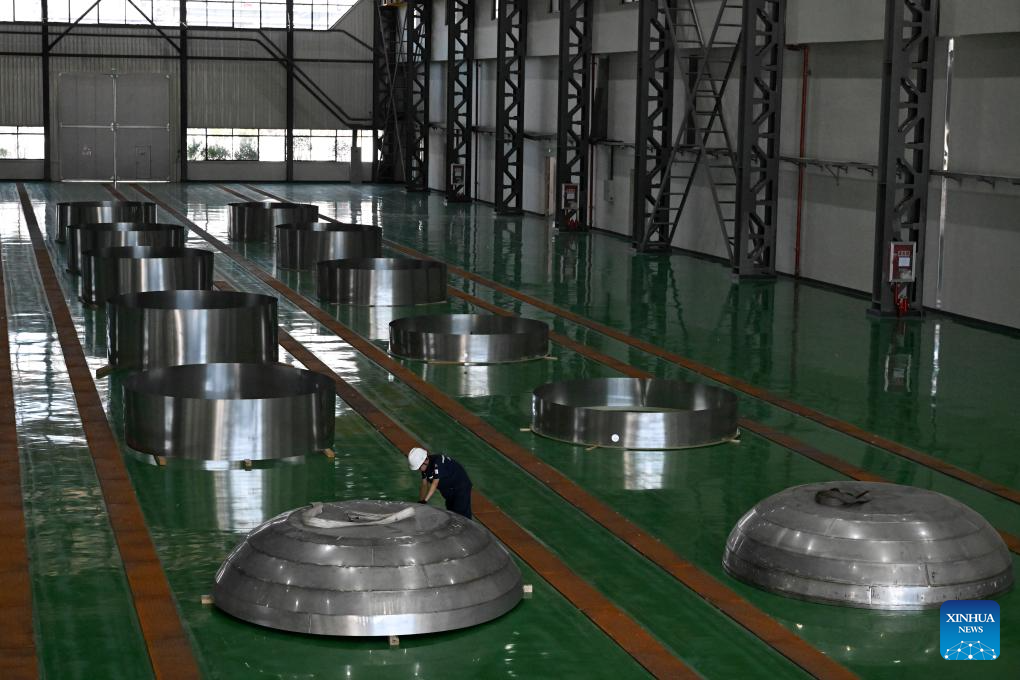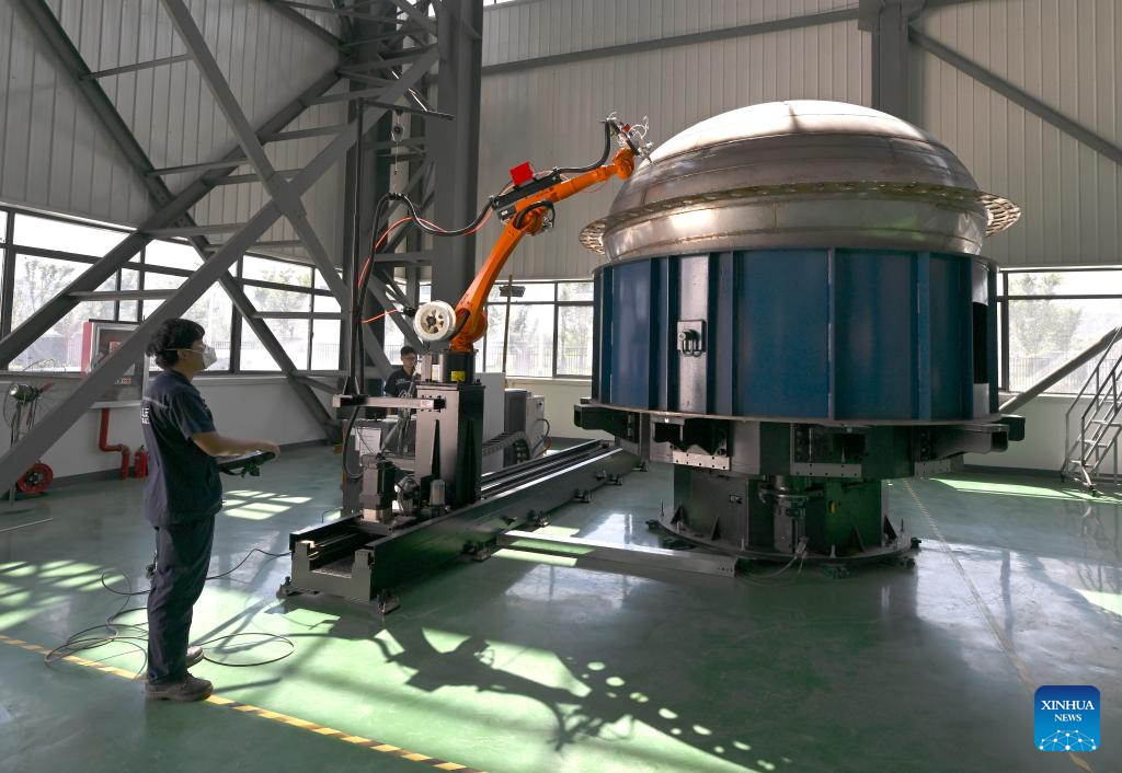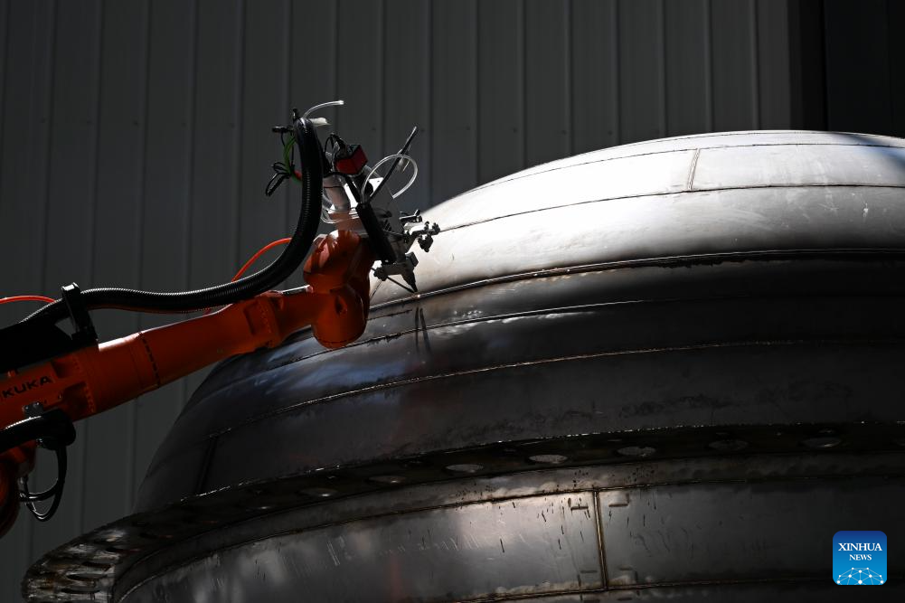 A welding robot welds the bottom of a rocket fuel tank at the workshop of Chinese private rocket company Deep Blue Aerospace in Bengbu City, east China's Anhui Province, July 3, 2025. In recent years, Anhui Province has accelerated the layout of its aerospace information industry, which encompasses low-altitude economy, commercial space, satellite applications, and deep space exploration. From booming "low altitude economy" such as drone delivery and low-altitude tourism, to the aggregation of enterprises into a commercial space industry chain, and the accelerating development of deep space exploration, Anhui further enhanced its independent innovation capabilities, and elevated aerospace information industry into a new growth pole for its economic development. (Xinhua/Huang Bohan)