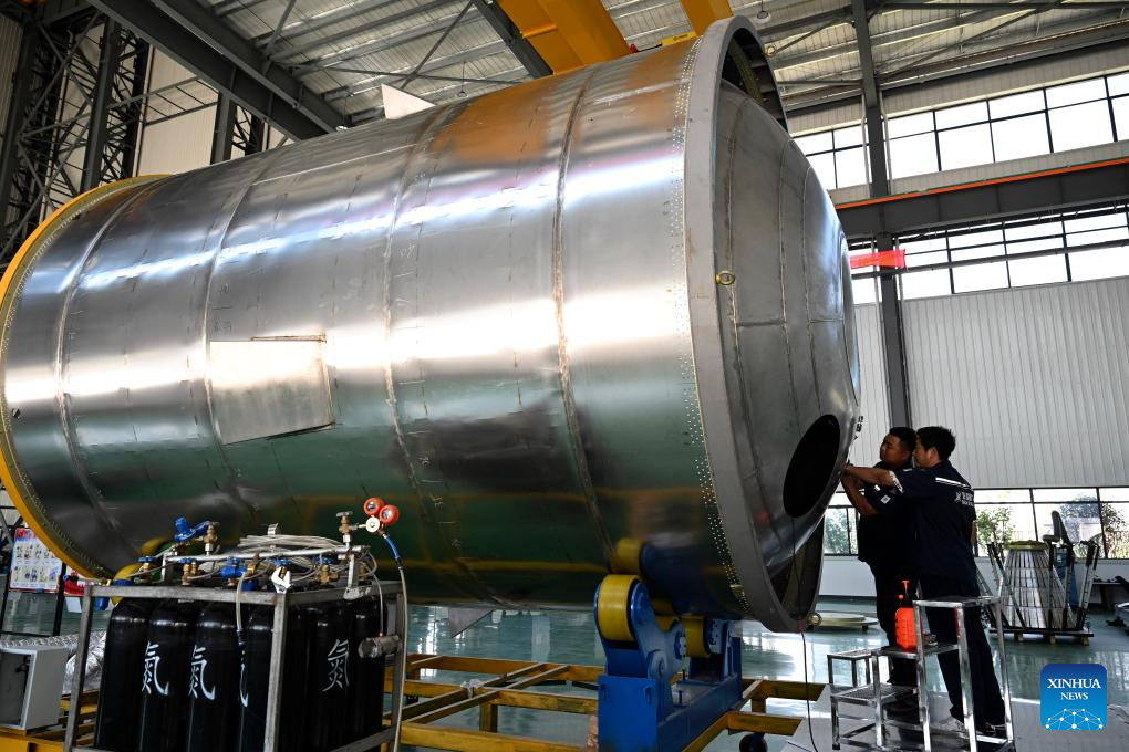 Staff members mark the welding points on a rocket fuel tank at the workshop of Chinese private rocket company Deep Blue Aerospace in Bengbu City, east China's Anhui Province, July 3, 2025. In recent years, Anhui Province has accelerated the layout of its aerospace information industry, which encompasses low-altitude economy, commercial space, satellite applications, and deep space exploration. From booming "low altitude economy" such as drone delivery and low-altitude tourism, to the aggregation of enterprises into a commercial space industry chain, and the accelerating development of deep space exploration, Anhui further enhanced its independent innovation capabilities, and elevated aerospace information industry into a new growth pole for its economic development. (Xinhua/Huang Bohan)