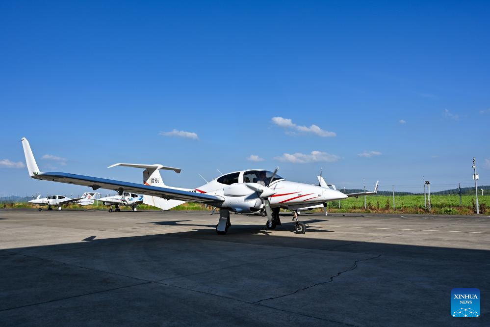A general aviation aircraft prepares to take off at an aerospace town in Wuhu City, east China's Anhui Province, July 3, 2025. In recent years, Anhui Province has accelerated the layout of its aerospace information industry, which encompasses low-altitude economy, commercial space, satellite applications, and deep space exploration. From booming "low altitude economy" such as drone delivery and low-altitude tourism, to the aggregation of enterprises into a commercial space industry chain, and the accelerating development of deep space exploration, Anhui further enhanced its independent innovation capabilities, and elevated aerospace information industry into a new growth pole for its economic development. (Xinhua/Zhang Cheng)