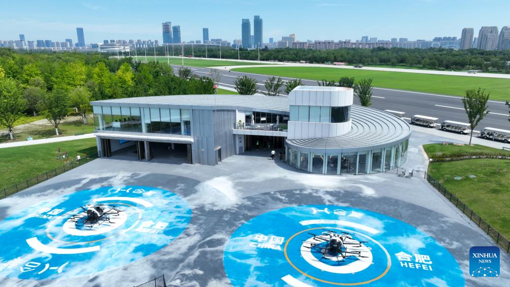 (250705) -- HEFEI, July 5, 2025 (Xinhua) -- A drone photo taken on July 2, 2025 shows two electric vertical take-off-and-landing (eVTOL) aircraft parking at the urban air transport hub in Hefei, east China's Anhui Province. In recent years, Anhui Province has accelerated the layout of its aerospace information industry, which encompasses low-altitude economy, commercial space, satellite applications, and deep space exploration. From booming "low altitude economy" such as drone delivery and low-altitude tourism, to the aggregation of enterprises into a commercial space industry chain, and the accelerating development of deep space exploration, Anhui further enhanced its independent innovation capabilities, and elevated aerospace information industry into a new growth pole for its economic development. (Xinhua/Zhou Mu)