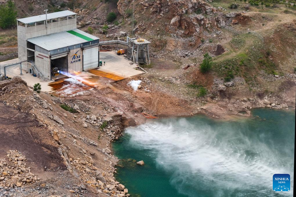 An aerial drone photo taken on April 24, 2025 shows the Jiuzhou Yunjian Longyun rocket engine undergoing an ignition test at a rocket engine test field in Bengbu City, east China's Anhui Province. In recent years, Anhui Province has accelerated the layout of its aerospace information industry, which encompasses low-altitude economy, commercial space, satellite applications, and deep space exploration. From booming "low altitude economy" such as drone delivery and low-altitude tourism, to the aggregation of enterprises into a commercial space industry chain, and the accelerating development of deep space exploration, Anhui further enhanced its independent innovation capabilities, and elevated aerospace information industry into a new growth pole for its economic development. (Photo by Huang Yangyang/Xinhua)