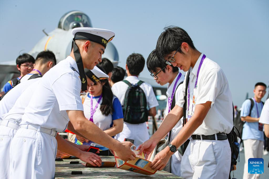 Students visit the aircraft carrier Shandong in Hong Kong, south China, July 4, 2025. A fleet of the Chinese People's Liberation Army (PLA) Navy led by the aircraft carrier Shandong arrived in the Hong Kong Special Administrative Region (HKSAR) on Thursday morning, kicking off a five-day visit. (Photo by Yang Jie/Xinhua)