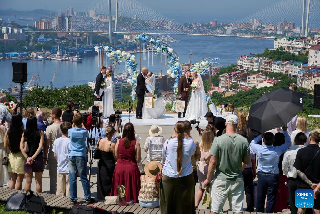 Three couples join in a group wedding ceremony at Highland Park in Vladivostok, Russia, July 5, 2025. Three newlywed couples join in a group wedding ceremony here on Thursday, receiving blessings from families and friends. (Photo by Guo Feizhou/Xinhua)