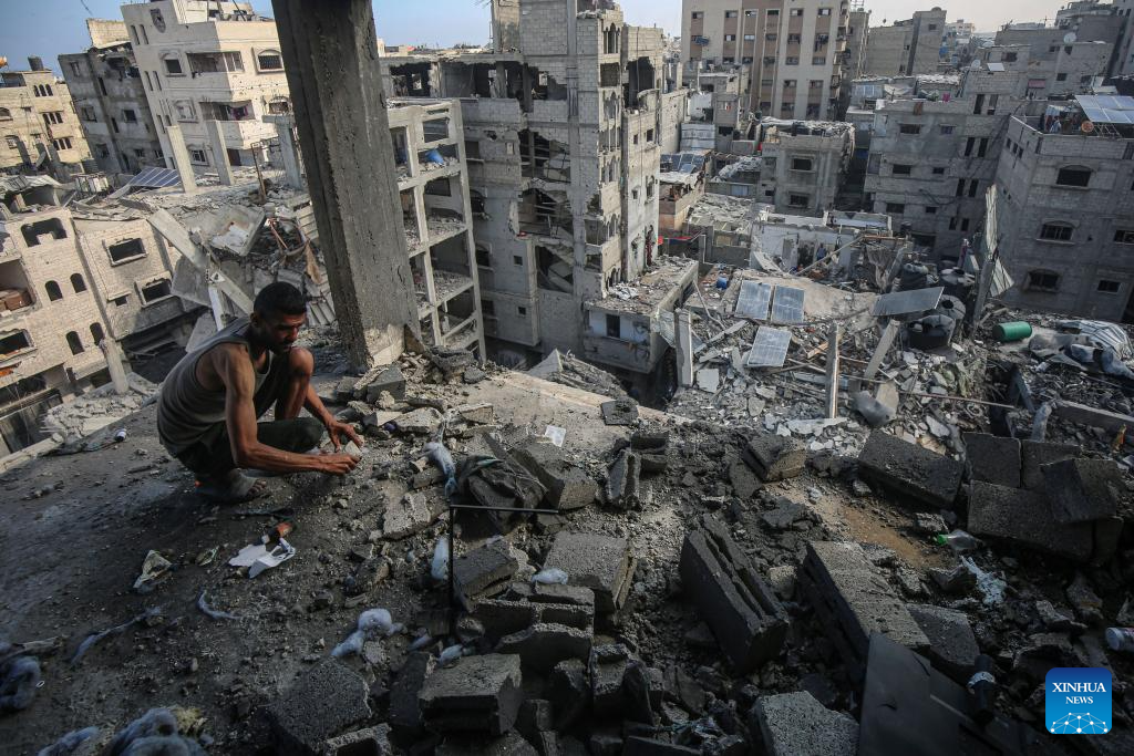 A Palestinian inspects a destroyed house after an Israeli airstrike in the al-Shati refugee camp, west of Gaza City, on July 4, 2025. (Photo by Rizek Abdeljawad/Xinhua)