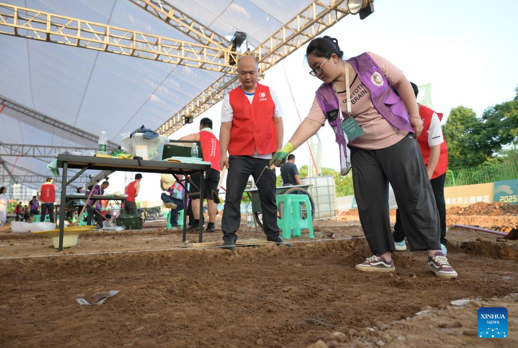 A contestant competes in archaeological excavation during the 2nd National Cultural Heritage Vocational Skills Competition in Luzhou City, southwest China's Sichuan Province, July 4, 2025. Starting from July 3, the four-day event attracted nearly 300 contestants competing in six categories. (Xinhua/Li He)