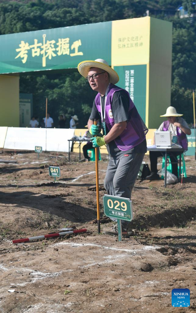 A contestant competes in archaeological excavation during the 2nd National Cultural Heritage Vocational Skills Competition in Luzhou City, southwest China's Sichuan Province, July 4, 2025. Starting from July 3, the four-day event attracted nearly 300 contestants competing in six categories. (Xinhua/Liu Kun)