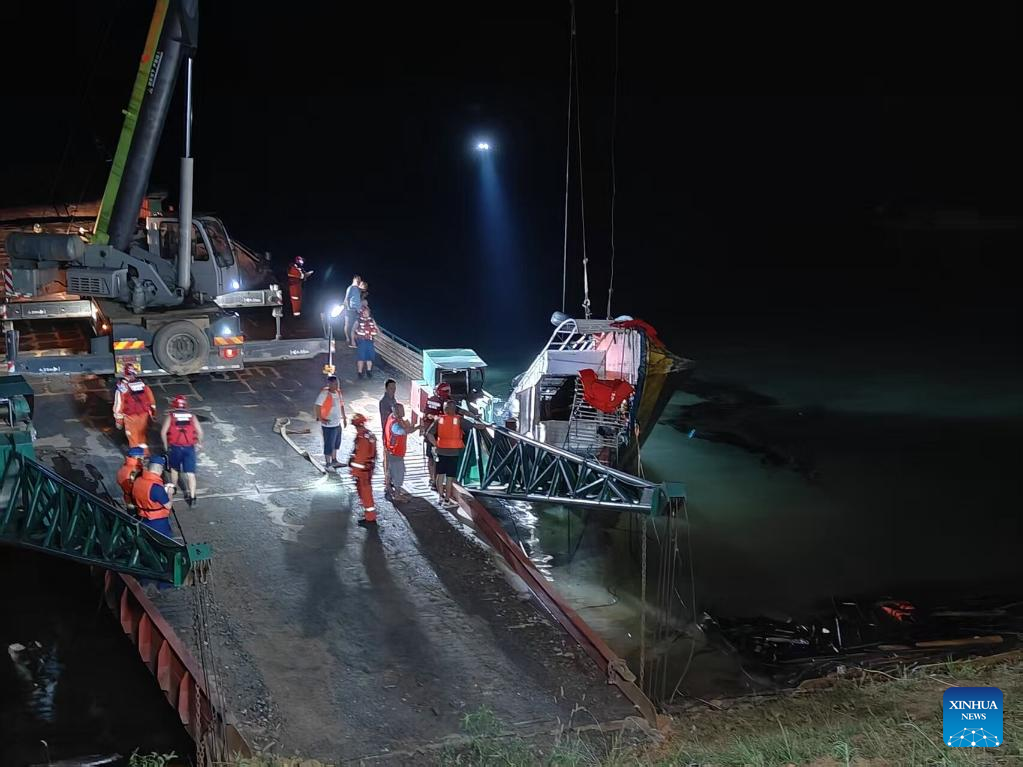 Rescuers work at a boat sinking site in Zixing City, Chenzhou, central China's Hunan Province, July 5, 2025. A boat sinking accident on Saturday afternoon left 1 person missing, with another 28 rescued, in central China's Hunan Province, authorities have said.