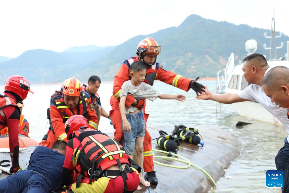Rescuers work at a boat sinking site in Zixing City, Chenzhou, central China's Hunan Province, July 5, 2025. A boat sinking accident on Saturday afternoon left 1 person missing, with another 28 rescued, in central China's Hunan Province, authorities have said. A total of 29 people fell off the 40-seat boat into the water, as the boat capsized at around 4:30 p.m. at Dongjiang Lake in the city of Zixing. As of 6 p.m., 28 had been rescued -- with one of them in critical condition receiving treatment. (Photo by Li Miaoxi/Xinhua)