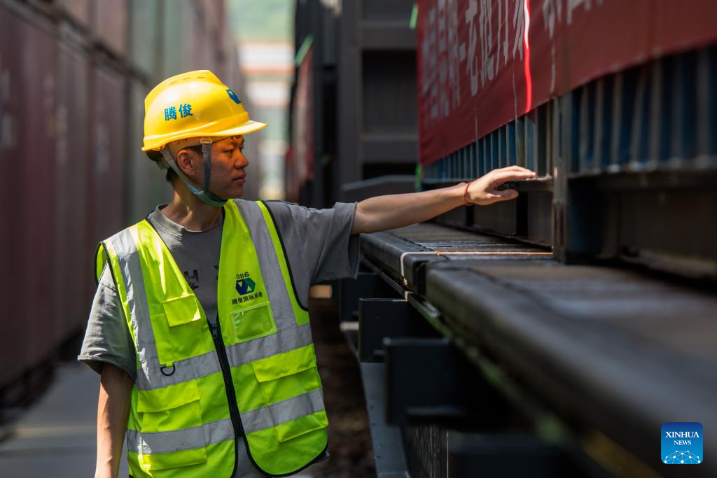 A staff member conducts inspection of the first train of the "Zheng He" Sea-Road-Rail International Multimodal Transport Service at Tengjun International Land Port in Kunming, capital of southwest China's Yunnan Province, July 4, 2025. The train left Kunming on Friday. After arriving in Vientiane of Laos via the China-Laos Railway, the goods will be transported to Thailand, Singapore and Bangladesh through other three routes. (Xinhua/Peng Yikai)