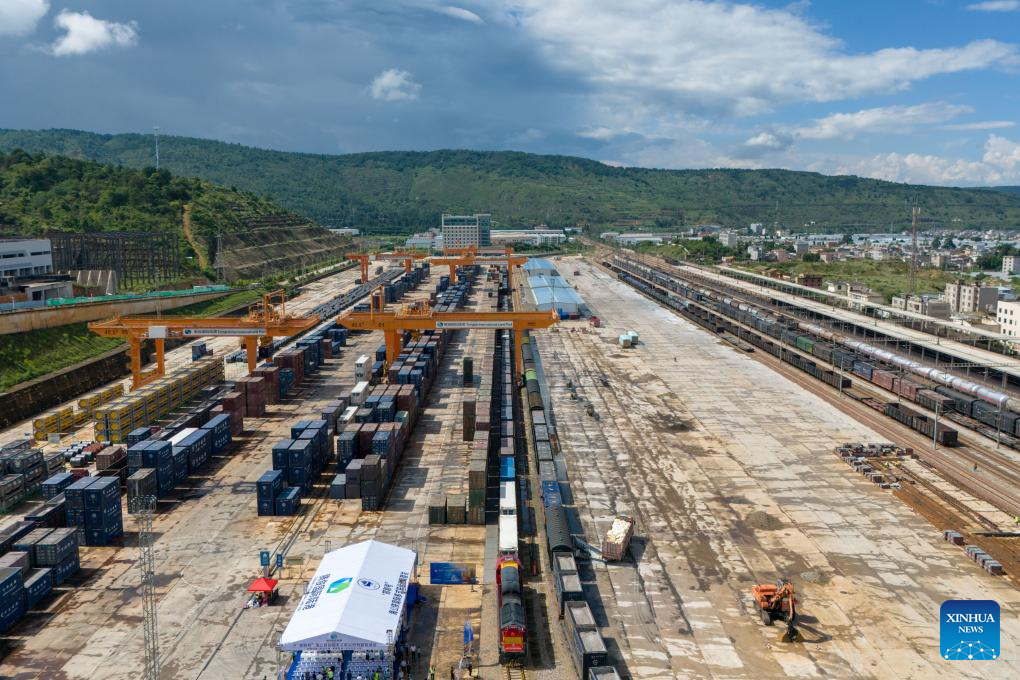 An aerial drone photo shows the first train of the "Zheng He" Sea-Road-Rail International Multimodal Transport Service waiting for departure at Tengjun International Land Port in Kunming, capital of southwest China's Yunnan Province, July 4, 2025. The train left Kunming on Friday. After arriving in Vientiane of Laos via the China-Laos Railway, the goods will be transported to Thailand, Singapore and Bangladesh through other three routes. (Xinhua/Peng Yikai)