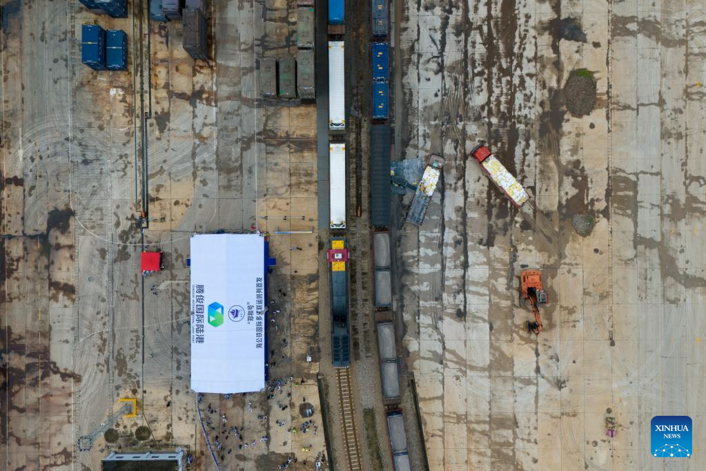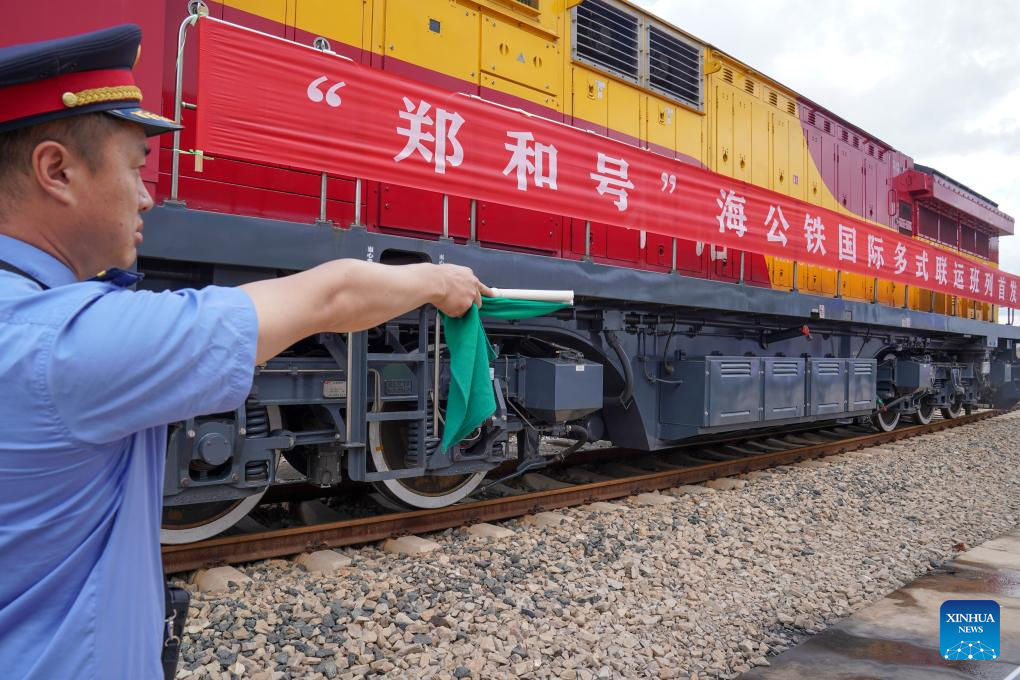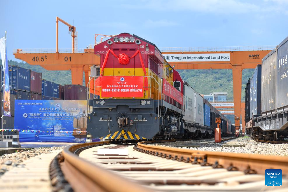 The first train of the "Zheng He" Sea-Road-Rail International Multimodal Transport Service departs from Tengjun International Land Port in Kunming, capital of southwest China's Yunnan Province, July 4, 2025. The train left Kunming on Friday. After arriving in Vientiane of Laos via the China-Laos Railway, the goods will be transported to Thailand, Singapore and Bangladesh through other three routes. (Xinhua/Peng Yikai)