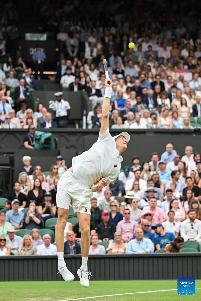 Jannik Sinner serves during the men's singles third round match between Jannik Sinner of Italy and Pedro Martinez of Spain at the Wimbledon Tennis Championships in London, Britain, July 5, 2025. (Xinhua/Zhao Dingzhe)