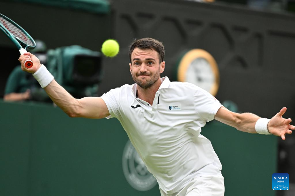 Pedro Martinez hits a return during the men's singles third round match between Jannik Sinner of Italy and Pedro Martinez of Spain at the Wimbledon Tennis Championships in London, Britain, July 5, 2025. (Xinhua/Zhao Dingzhe)