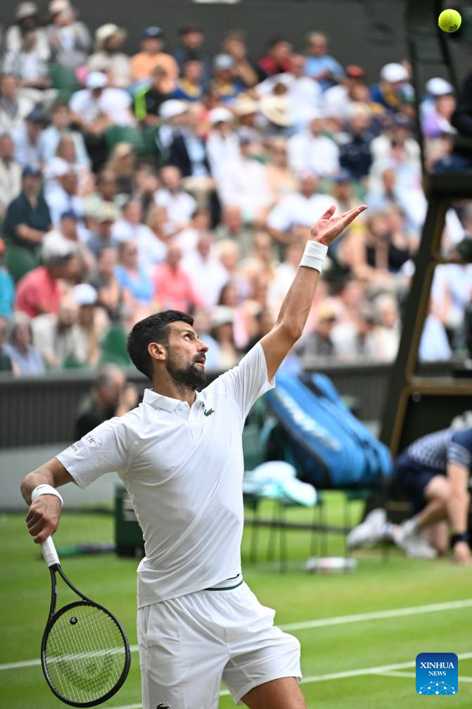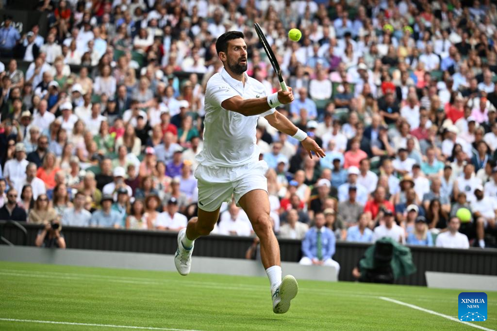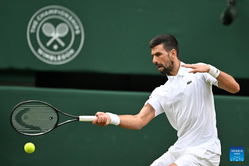 LONDON, July 5 (Xinhua) -- Seven-time champion Novak Djokovic joined men's top seed Jannik Sinner to reach the fourth round at Wimbledon with a straight-sets win over Miomir Kecmanovic on Saturday.