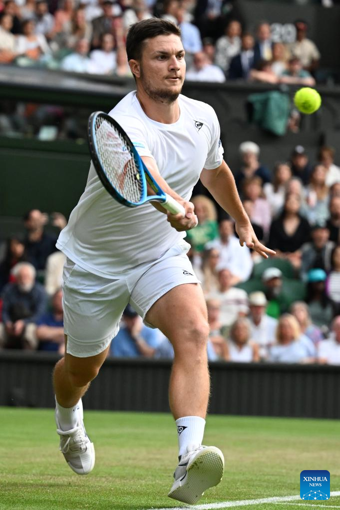 Miomir Kecmanovic hits a return during the men's singles third round match between Novak Djokovic of Serbia and Miomir Kecmanovic of Serbia at the Wimbledon Tennis Championships in London, Britain, July 5, 2025. (Xinhua/Zhao Dingzhe)