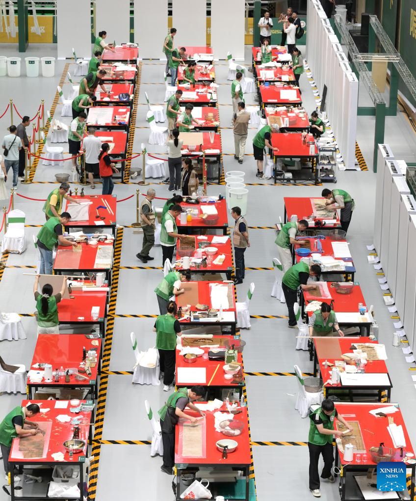 Contestants compete in paper calligraphy and painting relic restoration during the 2nd National Cultural Heritage Vocational Skills Competition in Luzhou City, southwest China's Sichuan Province, July 4, 2025.