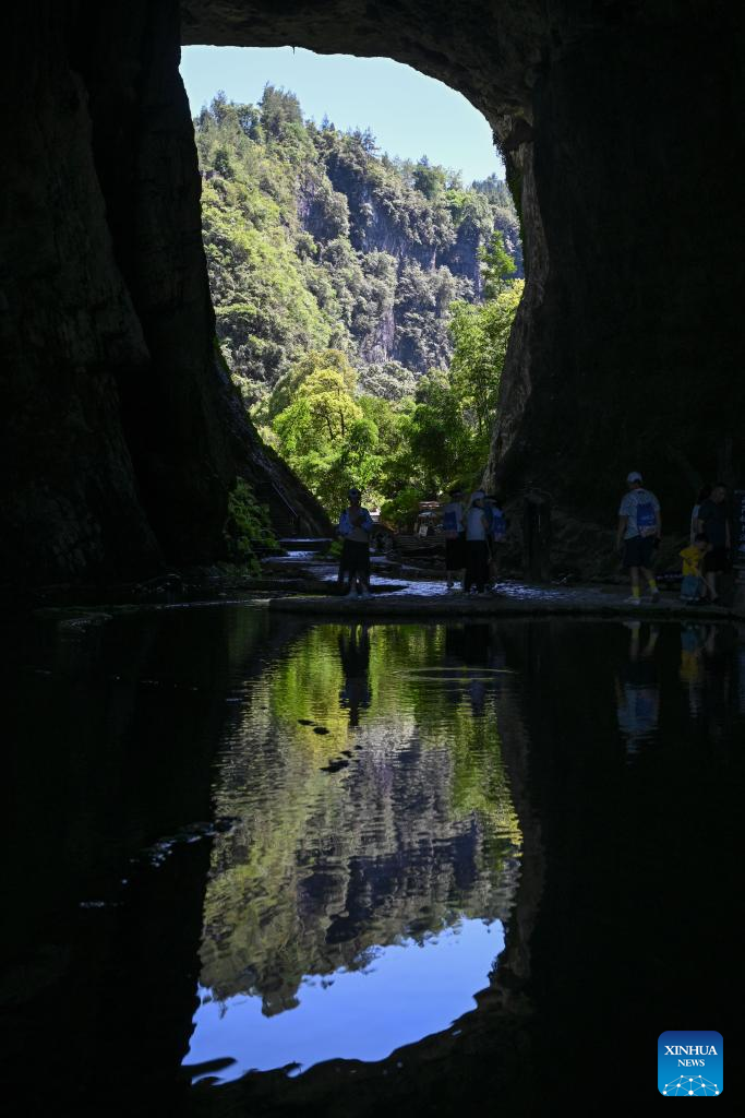 Tourists visit the Taohuayuan scenic spot in Youyang Tujia and Miao Autonomous County, southwest China's Chongqing Municipality, July 5, 2025. (Xinhua/Chen Cheng)