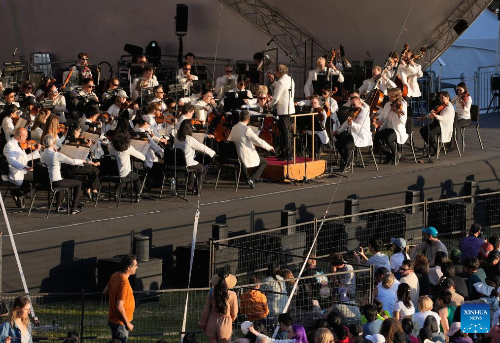 People watch a music performance by the Vancouver Symphony Orchestra during the "Symphony at Sunset" concert at Sunset Beach Park in Vancouver, British Columbia, Canada, July 5, 2025. (Photo by Liang Sen/Xinhua)