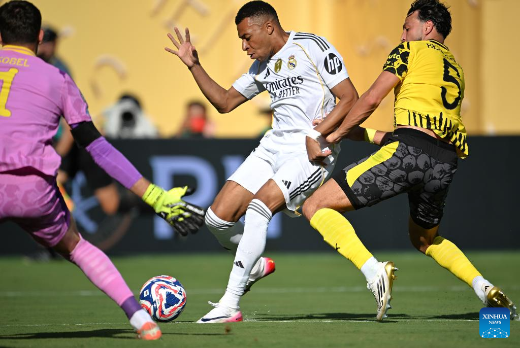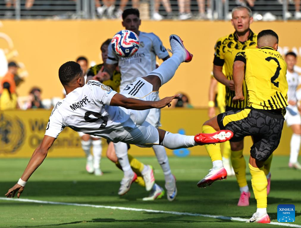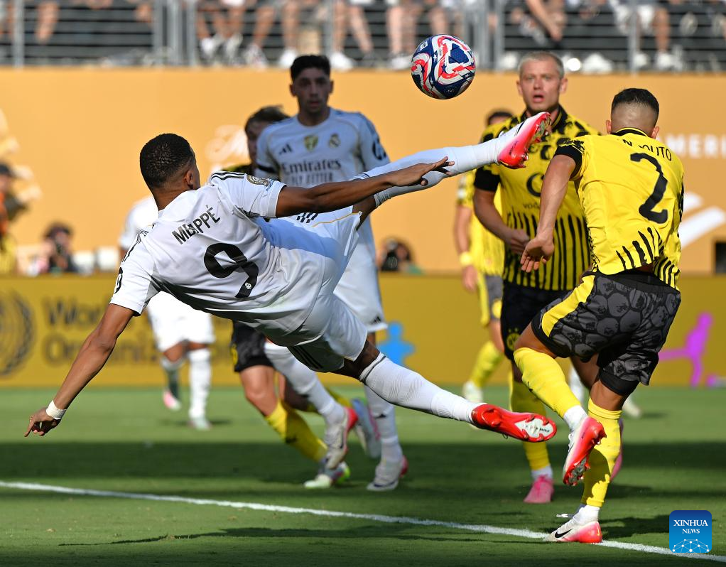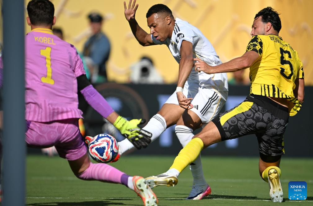 Kylian Mbappe (L) of Real Madrid scores with a volley during the quarterfinal match between Real Madrid (Spain) and Borussia Dortmund (Germany) at the FIFA Club World Cup 2025 in New Jersey, the United States, July 5, 2025. (Xinhua/Wu Xiaoling)
