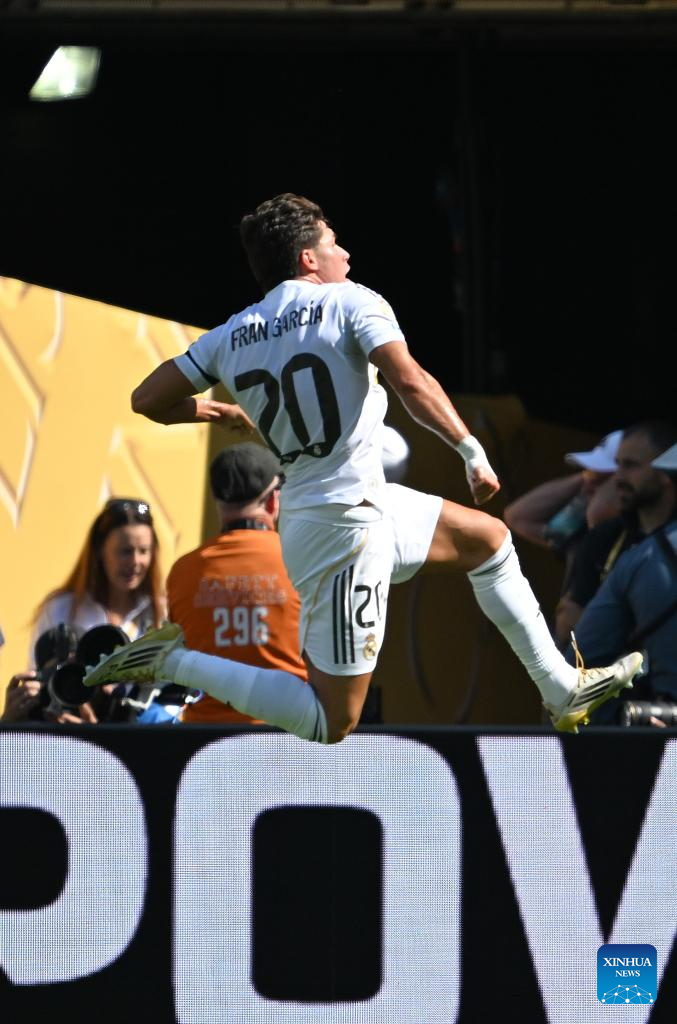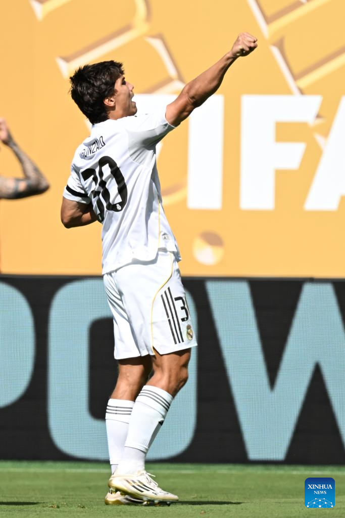 Fran Garcia of Real Madrid celebrates a goal during the quarterfinal match between Real Madrid (Spain) and Borussia Dortmund (Germany) at the FIFA Club World Cup 2025 in New Jersey, the United States, July 5, 2025. (Xinhua/Wu Xiaoling)